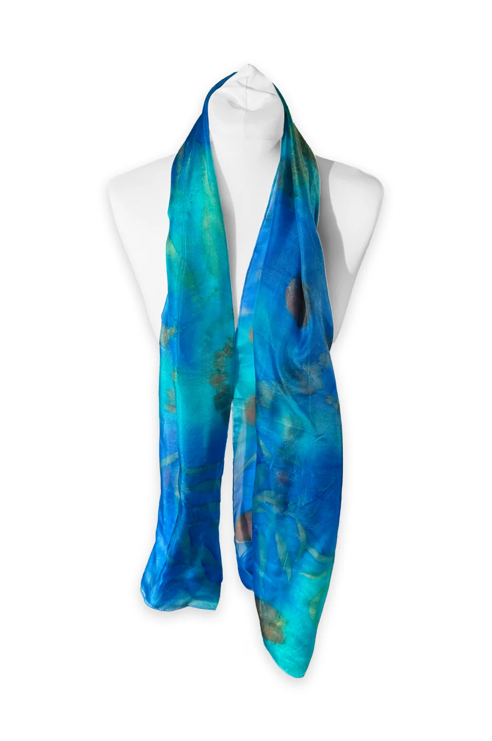 Šis išskirtinis rankų darbo šilkinis šalikas pagamintas iš natūralaus šilko, pasižyminčio lengvumu, švelnumu ir subtiliu blizgesiu. Unikalus žalsvai melsvų atspalvių, natūralių augalų ir lapų raštas suteikia gaivumo ir modernios elegancijos, todėl šalikas lengvai derinamas tiek prie kasdienės, tiek prie šventinės aprangos.