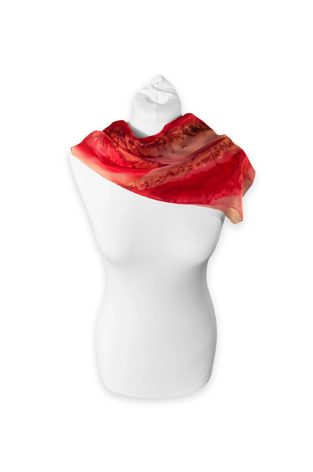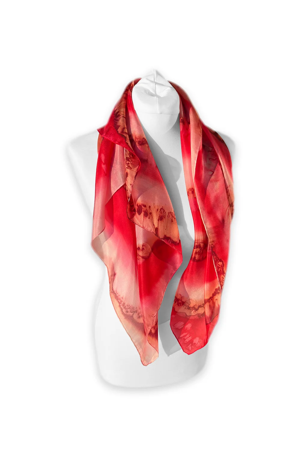Ši išskirtinė rankų darbo šilkinė skara pagaminta iš natūralaus šilko, pasižyminčio lengvumu, švelnumu ir subtiliu blizgesiu. Unikalus rausvai raudonų atspalvių raštas suteikia gaivumo ir modernios elegancijos, todėl skara lengvai derinama tiek prie kasdienės, tiek prie šventinės aprangos.