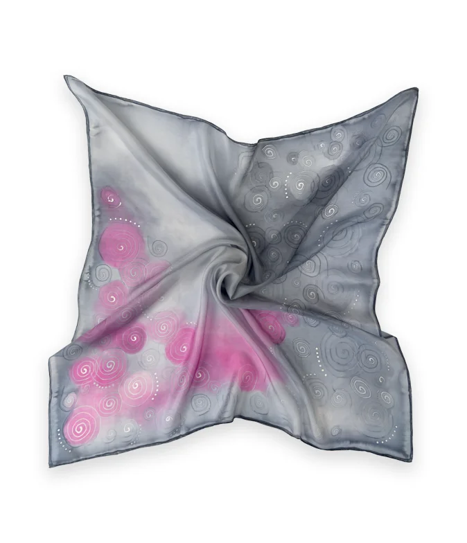 Ši išskirtinė rankų darbo šilkinė skara pagaminta iš natūralaus šilko, pasižyminčio lengvumu, švelnumu ir subtiliu blizgesiu. Unikalus pilkų ir rausvų atspalvių raštas suteikia gaivumo ir modernios elegancijos, todėl skara lengvai derinama tiek prie kasdienės, tiek prie šventinės aprangos.