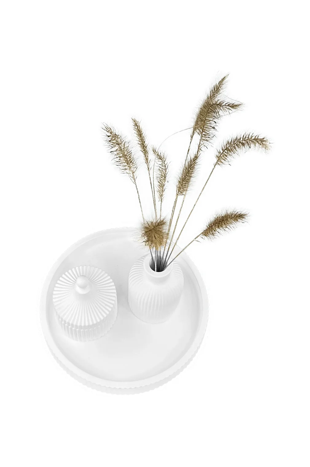 Minimalistinė rankų darbo vaza iš mineralinės dervos – subtilus ir stilingas interjero akcentas. Švelnios vertikalios linijos ir matinė balta spalva suteikia elegancijos bei lengvai įsilieja į modernų, skandinavišką ar minimalistinį interjerą.
