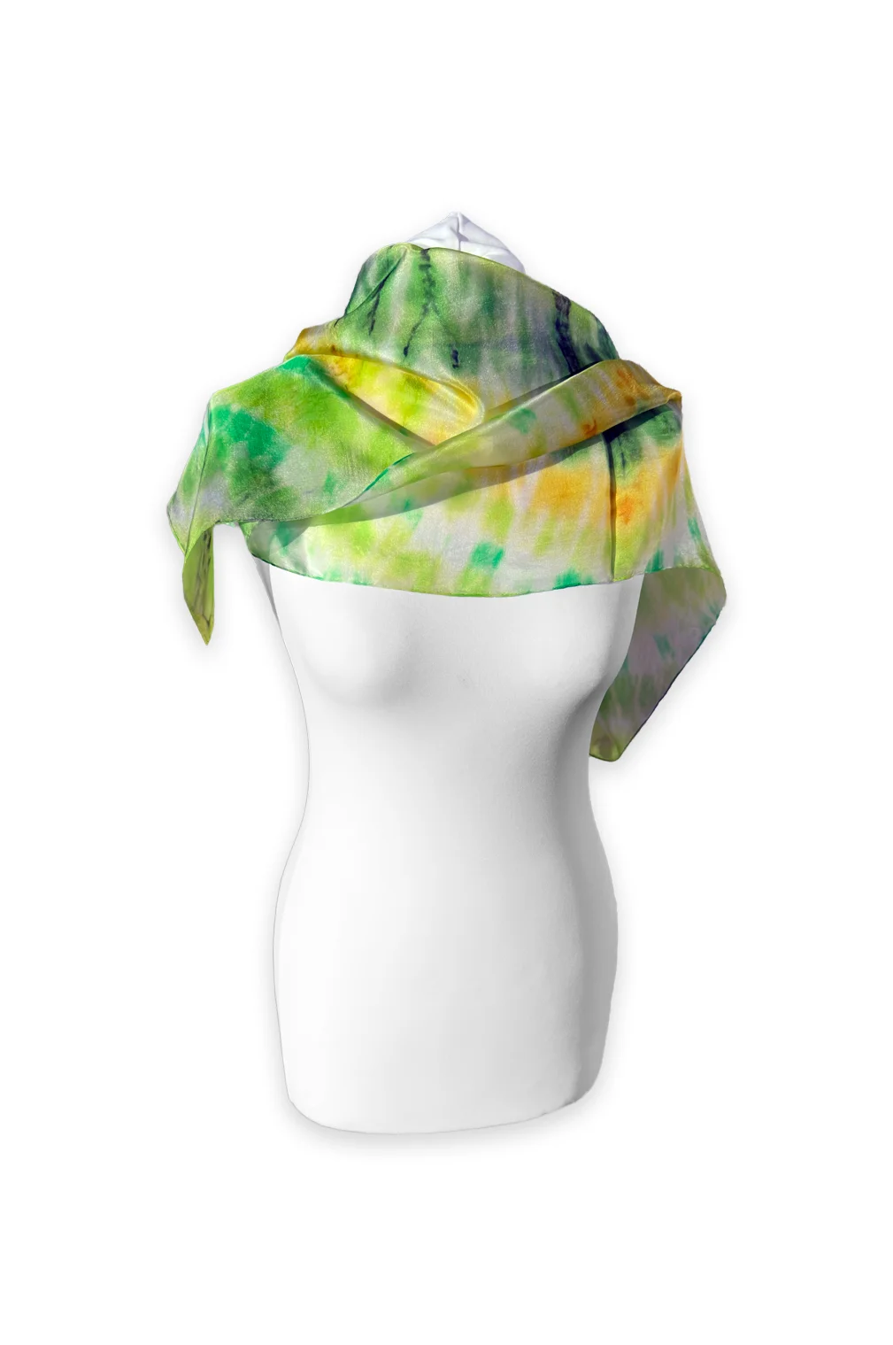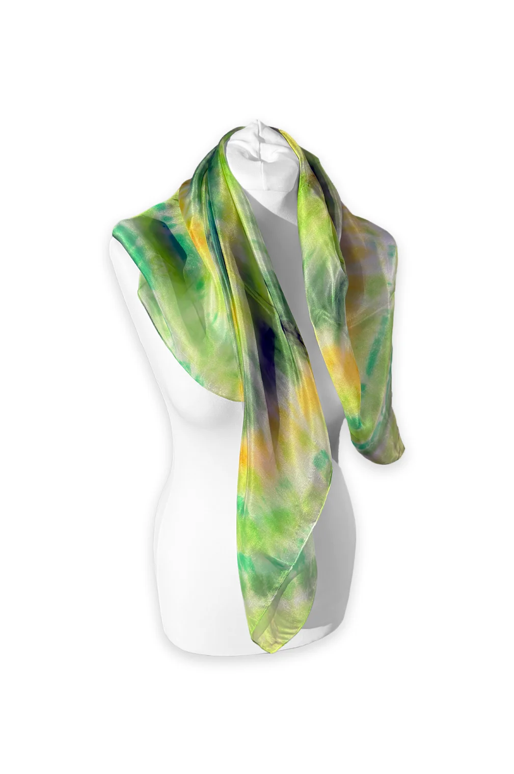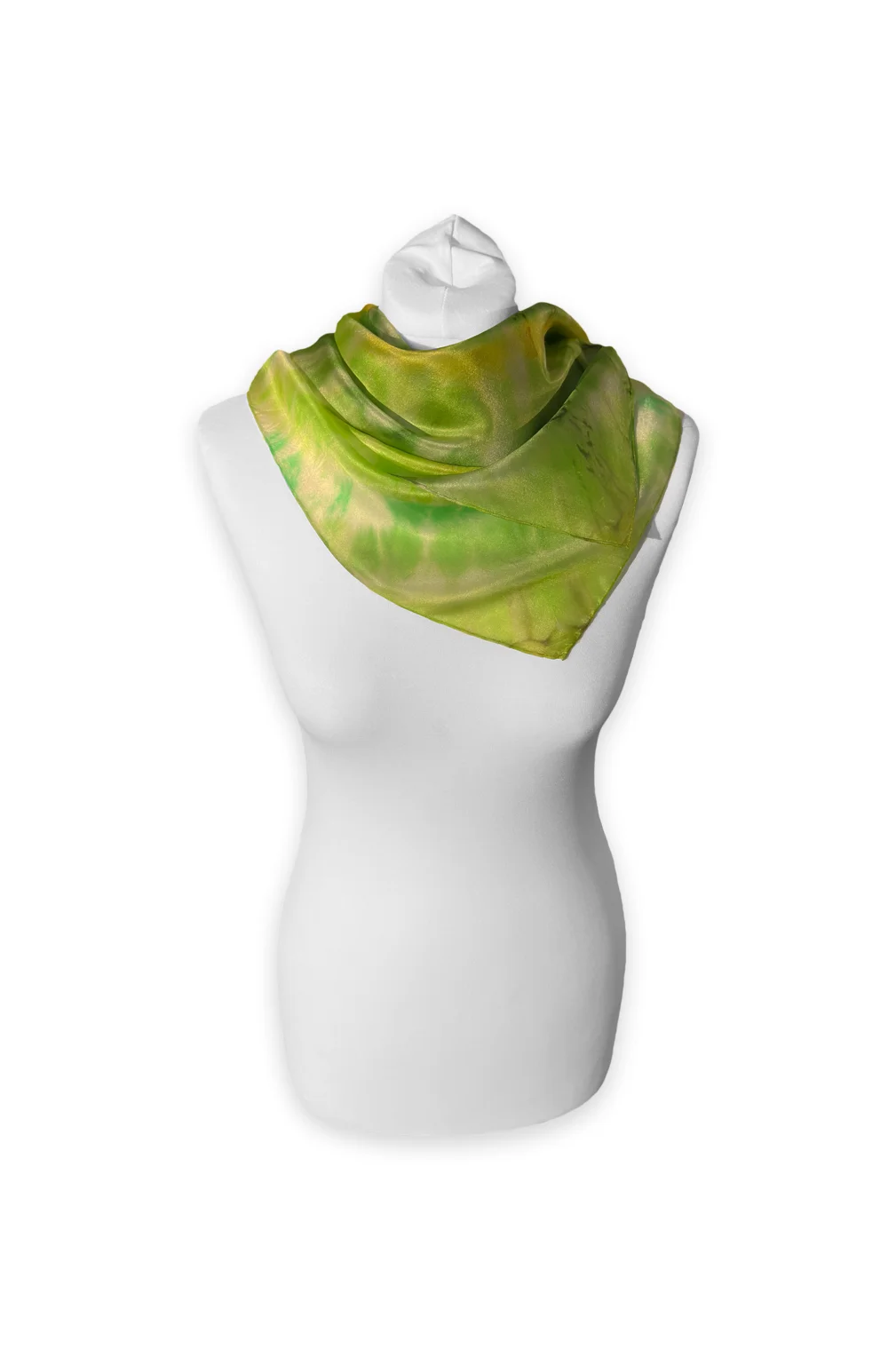 Ši išskirtinė rankų darbo šilkinė skara pagaminta iš natūralaus šilko, pasižyminčio lengvumu, švelnumu ir subtiliu blizgesiu. Unikalus žalsvai geltonų atspalvių raštas suteikia gaivumo ir modernios elegancijos, todėl skara lengvai derinama tiek prie kasdienės, tiek prie šventinės aprangos.