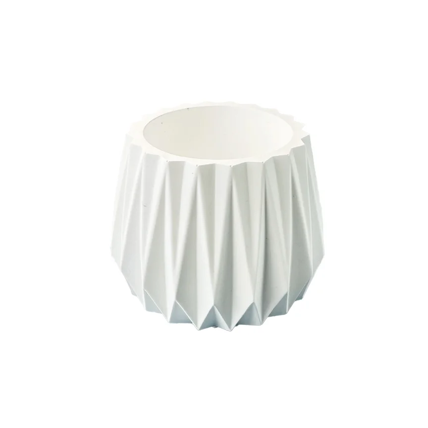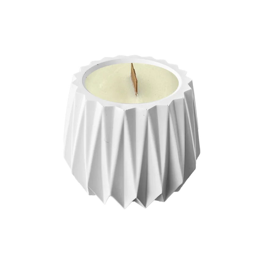 Sojų vaško žvakė, prabangiame itin baltos spalvos mineralinės dervos rankų darbo M dydžio indelyje.